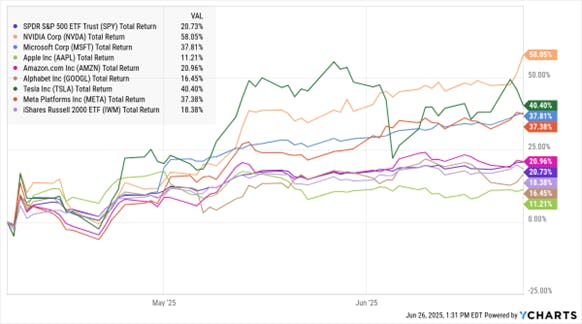 Nvidia Corp. (NVDA) is the Big Tech name with the most post-“Liberation Day” juice – up 58%. Tesla Inc. (TSLA) isn’t far behind, with a 40.4% rally. Next are Microsoft Corp. (MSFT) and Meta Platforms Inc. (META), both nipping at Tesla’s heels with gains of 37.8% and 37.3%. Only Apple Inc. (AAPL) and Alphabet Inc. (GOOGL) are notably lagging (+11.2% and +16.4%, respectively).