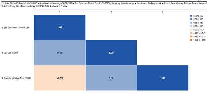 Oil is a commodity, and as mentioned in a previous article, there are two primary ways commodities benefit investors, (i) as a hedge against inflation and (ii) as a portfolio diversifier. In looking at the historical pricing data for Brent Crude Oil over time, there is clear evidence of the positive correlation between inflation and commodities; as oil prices have moved in tandem with inflation. Furthermore, the correlation matrix contrasting the performance of the S&P GSCI Brent Crude TR USD, a benchmark for investment performance in the Brent crude oil market, versus the S&P 500 TR Index (US Equity proxy) and Bloomberg US Aggregate Bond Index TR (US Fixed Income proxy) highlights the below-average to negligible relationship that exists between oil and the other two asset classes.