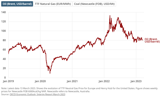 As noted in the OECD’s March 2023 Economic Outlook Interim Report, though the Russia-Ukraine war led to a wide-spread increase in global energy, since the beginning of the calendar year, energy costs have been relatively muted – but still above their pre-war levels. While the decline in oil from a peak of $130 to $80 has had a material impact on global purchasing power, by way of lower energy costs, a gradual increase will exacerbate an already tenuous economic environment and potentially further dampen global economic output.