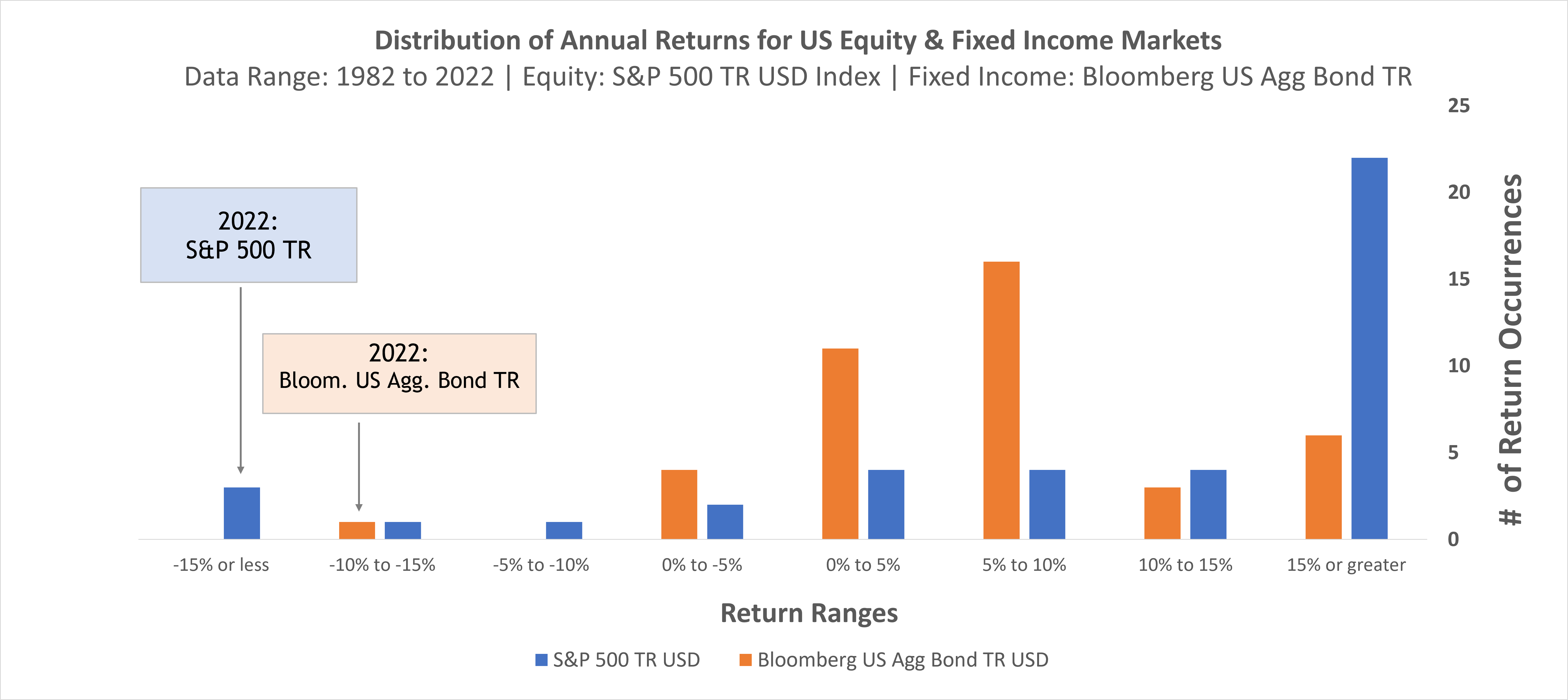 While the headline shock of negative returns may cause trepidation, having a relative perspective is key. Large market downturns are quite rare, and their occurrence should be put into proper context. For 2022, the returns of the S&P 500 Index and the Bloomberg US Aggregate Bond Index were -18.11% and -13.01%, respectively, far below their historical expected performance range. Simply put, 2022 was an exceptional year, not the norm of what investors can expect over a long investment cycle; understanding this fact is essential to any portfolio planning that occurs.