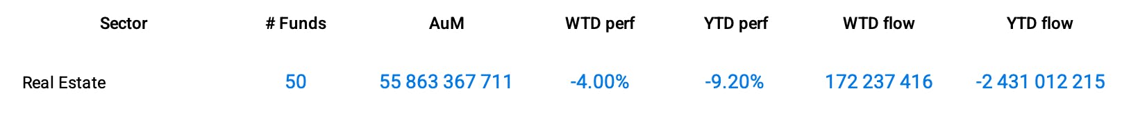 It was a tough week for real estate funds following the sudden spike in Treasury bond yields. The yield on the 10-year Treasury bond surged to 4.93% from 4.63% - a level unseen since 2007, the year that saw the start of the subprime mortgage crisis. As a result, the real estate sector - already one of the worst performers within the S&P 500 index so far this year - plunged 4.64% over the week, bringing its year-to-date performance to -11.64%.