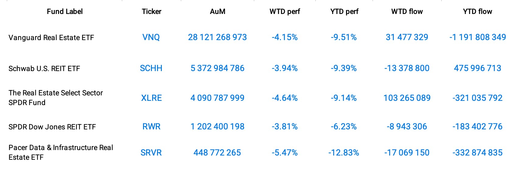 Large funds were not immune to the industry-wide downturn either. The Vanguard Real Estate ETF (VNQ) witnessed its NAV contract by 4.15%, while even stalwarts like Schwab U.S. REIT ETF (SCHH) registered losses amounting to 3.94%.