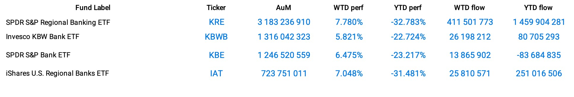 During the week, PacWest Bancorp (PACW.O) witnessed a substantial surge of 25.93% but remained down 74.76% year-to-date. Similarly, Western Alliance Bancorp (WAL.N) experienced a notable leap of 24.94% but was still down 41.33% year-to-date. Comerica Inc (CMA.N) recorded a gain of 19.92%. KeyCorp (KEY.N) added 9.23% while Fifth Third Bancorp (FITB.O) climbed by 6.27%. The KBW Regional Banking Index (.KRX) rose 6.19% bringing its year-to-date performance to a loss of 27.34%. The S&P Financials sector rose 2.18% but it still suffered a 5.02% decline for the year.