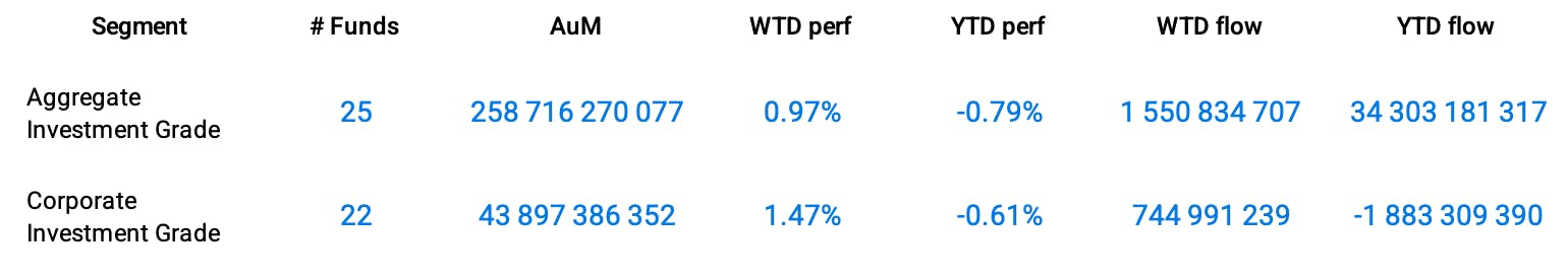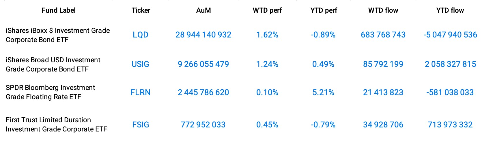 IG bond ETFs rebounded accordingly, recording significant inflows. The iShares iBoxx$ Investment Grade Corporate Bond ETF (LQD) gained 1.62% and registered US$ 684 million of inflows, while the iShares Broad USD Investment Grade Corporate Bond ETF rose by 1.24% and attracted US$ +86 million of positive flows.