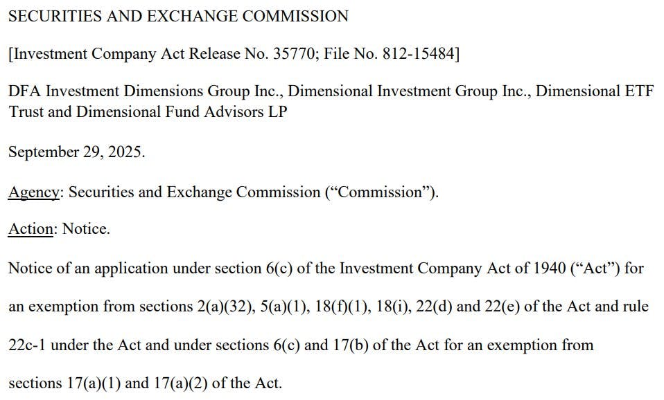 The U.S. Securities and Exchange Commission (SEC) has issued a notice indicating its intent to approve ETF share classes of existing mutual funds, granting Dimensional Fund Advisors the first exemption of its kind since Vanguard’s long-standing patent expired in May 2023.