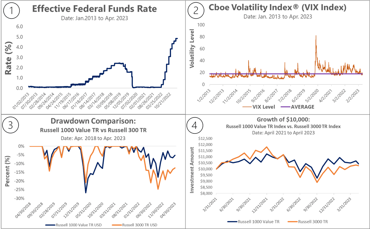In the current market environment of elevated interest rates (panel 1) and above-average market volatility (panel 2), the performance of value, large-cap equities has been comparatively better than that of the broader equity market. As illustrated in panels 3 and 4 of the following chart, the recent drawdown performance of the Russell 1000 Value Index has been less than that of the broader market, as reflected by the Russell 3000 TR Index.