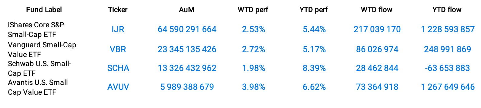 Drilling down further into specific fund-level data reinforces this trend. Both iShares Core S&P Small-Cap ETF and Vanguard Small-Cap Value ETF reported strong performance of +2.53% and +2.72% for the week respectively, alongside capital inflows of $217 million and $86 million.