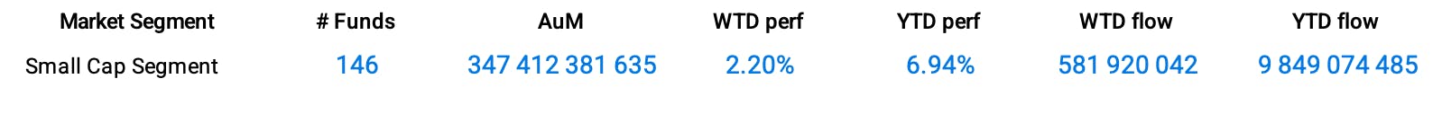 And a review of aggregated metrics conveyed similar findings. The small cap market segment, composed of 146 funds, achieved performance of +2.20% over the past week, while also generating robust capital flows totaling around $581 million, with nearly $10 billion since the start of year. It’s fair to say that small-cap stocks are successfully compensating for their early year performance lag.