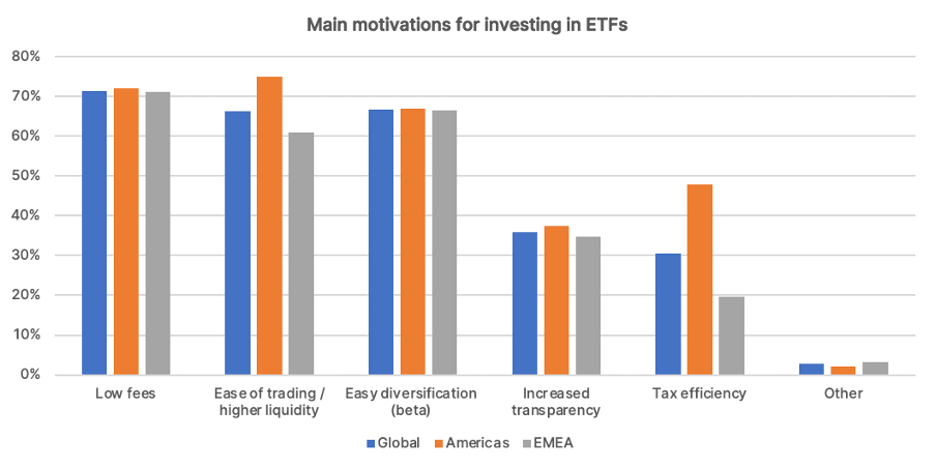 Investors have clearly taken note of this consideration. According to the 2023 Trackinsight Global ETF Survey, an overwhelming majority of respondents from all regions agreed that low fees were the primary reason for investing in ETFs, beating out other considerations like liquidity, diversification, and transparency.