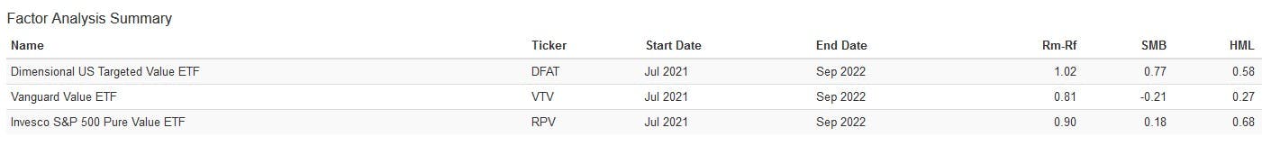I conducted a factor regression of all three funds from July 2021 to the present (limited by DFAT's short history). In terms of loadings for value, RPV and DFAT scored the highest as expected. VTV's value loading was significantly lower. Interestingly, DFAT also had high loadings for size, thanks to its many mid-cap and small-cap stocks. This is another risk factor that has historically driven higher returns.