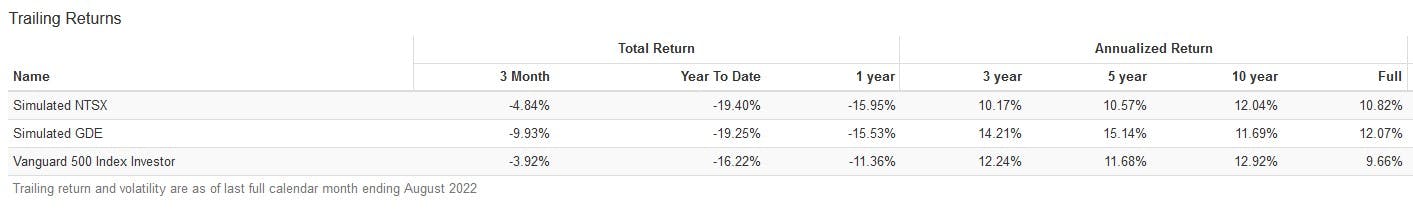 Here's how a simulated NTSX and GDE would have performed versus the S&P 500 from 1992 to the present day. Keep in mind that this backtest is hypothetical in nature, does not reflect actual investment results and is not a guarantee of future results. The hypothetical returns do not reflect trading costs, transaction fees, commissions, or actual taxes due on investment returns.
