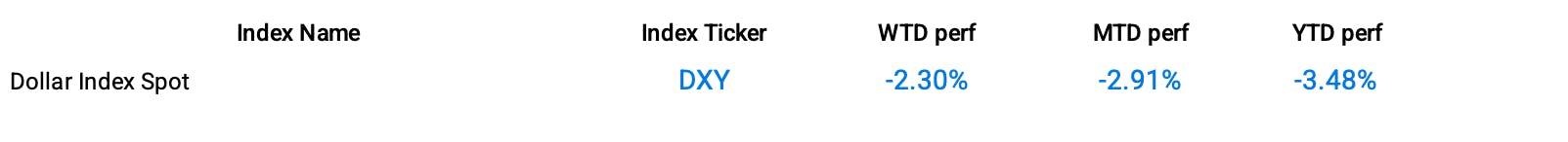 Against a basket of six currencies, the dollar index fell 2.27% week-over-week to 99.95, after dropping earlier to 99.50, a new 15-month low.