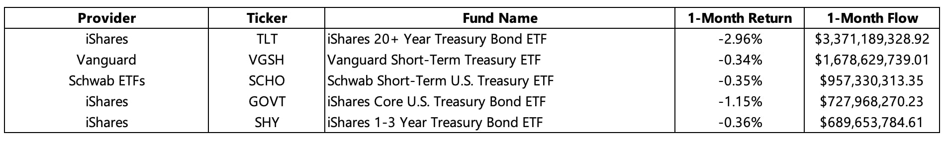 Against the backdrop of strong political posturing regarding the US debt ceiling, the bond market, particularly U.S. Treasury bonds, was adversely affected this month. In the weeks leading up to the eventual resolution, uncertainty as to whether the US government might risk defaulting on their debt was a real concern and was evident in the performance of fixed income ETFs. While all top five funds had a negative performance, the iShares 20+ Year Treasury Bond ETF (TLT) had the worst performance yet garnered the most flows. The performance of all short-term funds, namely Vanguard Short-Term Treasury ETF (VGSH), Schwab Short-Term U.S. Treasury (SCHO), and iShares 1-3 Treasury Bond ETF (SHY), were similar in nature.