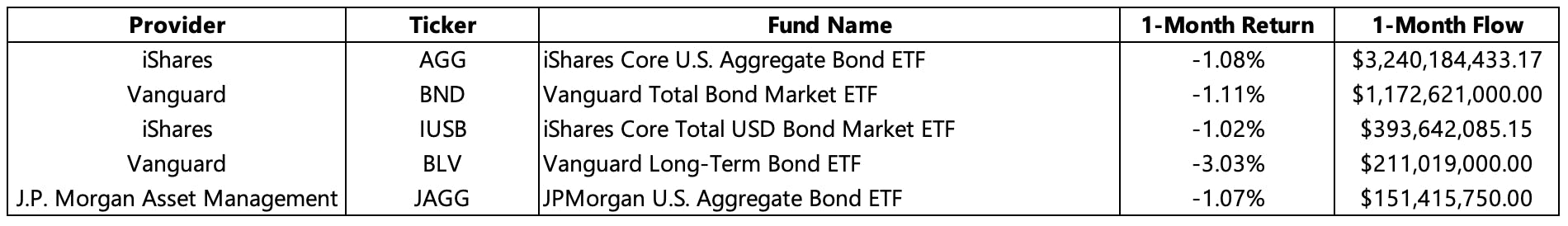 As referenced earlier, the political posturing regarding the US debt ceiling negatively impacted the performance of fixed income solutions, nevertheless, flows into US Aggregate Bonds were still significant for the month. The iShares Core U.S. Aggregate Bond ETF (AGG) garnered the most fund flows, followed by the Vanguard Total Bond Market ETF (BND) and iShares Core Total USD Bond Market ETF (IUSB). Among the top five funds, performance was similar in nature, apart from the Vanguard Long-Term Bond ETF (BLV), which returned -3.03% for the month.