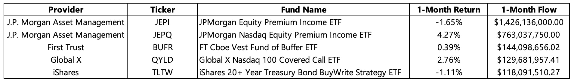 The occurrence of multiple bank failures and the discourse about whether the debt ceiling should be raised has elevated market uncertainty and led more investors to utilize structured products as a means of managing market volatility. The JP Morgan Equity Premium ETF (JEPI) garnered the majority of fund flows in this segment for the month, as it has become a top-of-mind solution for market risk mitigation by many investors. However, the JP Morgan Nasdaq Equity Premium Income ETF (JEPQ) continues to be a top performer; exhibiting a strong performance for the month – building on its positive performance in April 2023. The Global X Nasdaq 100 Covered Call ETF (QYLD) performed well for the month, returning 2.76% and garnering sizable fund flows.