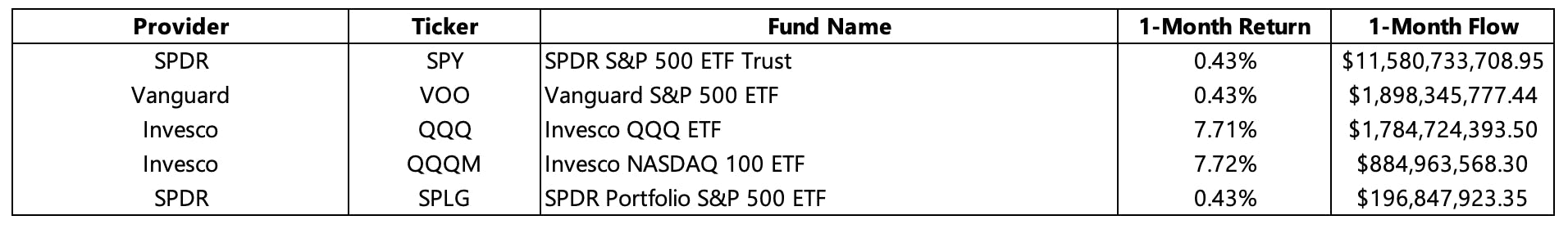 Despite the issues that have plagued markets thus far in 2023, the performance of the S&P 500 index is markedly better than it was a year ago, at this same point in time. Year to date, the performance of the index has been 9.65%, leading many investors to invest in funds that track it. The SPDR S&P 500 ETF Trust (SPY) attracted the most flows with $11.58 billion. While also attracting sizable flows, the strong monthly performance of the Invesco QQQ ETF (QQQ) and Invesco NASDAQ 100 ETF (QQQM) is what differentiates these funds from their peers. The performance of these mandates can largely be attributed to the strong performance of their underlying holdings, the FANG+ companies - particularly NVIDIA and Broadcom, which were among the best performing equities for the month.
