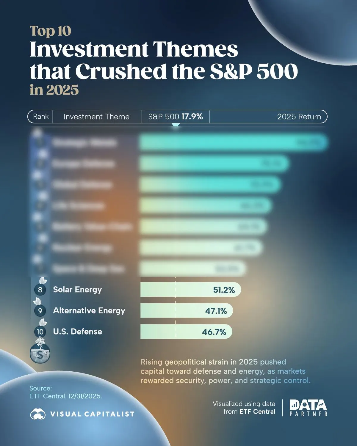 In our latest collaboration with Visual Capitalist, we visualize the top 10 investment themes that outperformed the S&P 500 in 2025. Visit the original post to explore the year’s best-performing themes.